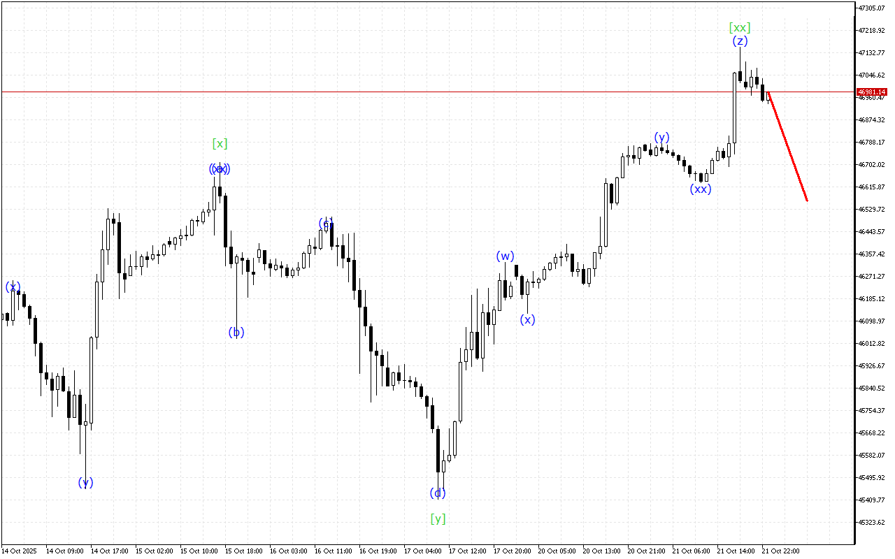 Існує розвиток потрійної трихвильової структури на більш високому таймфрейме. Наразі сформована хвиля [xx]. Після цього ціна повинна відновити рух вниз.