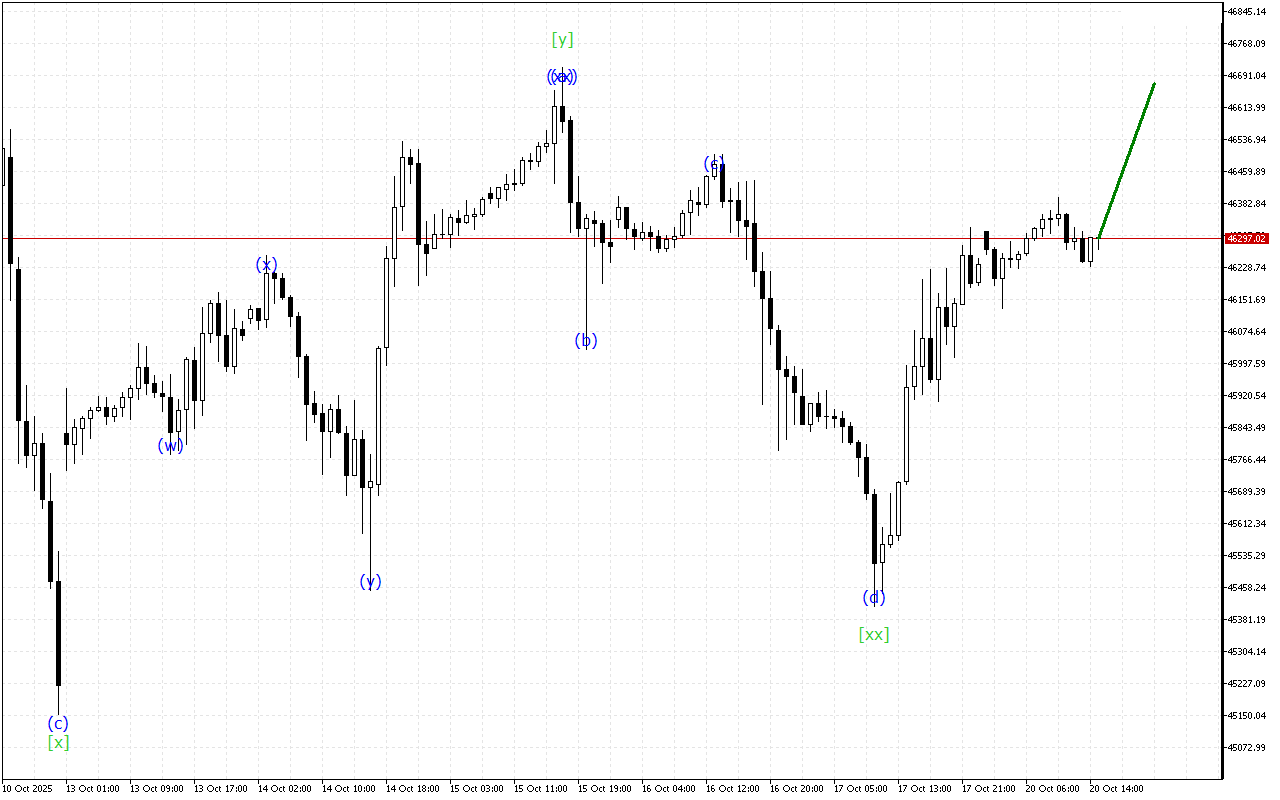 Середньостроковий вектор руху Dow Jones вказує на формування структури потрійних трьох хвиль. Зараз завершено формування хвилі [xx] і очікується початок висхідного руху в межах хвилі [z].