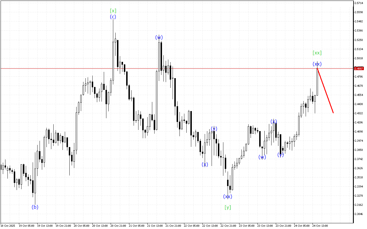 Існує розвиток потрійної трихвильової структури на більш високому таймфрейме. Наразі сформована хвиля [xx]. Після цього ціна повинна відновити рух вниз.