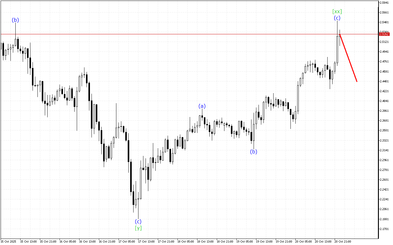 Існує розвиток потрійної трихвильової структури на більш високому таймфрейме. Наразі сформована хвиля [xx]. Після цього ціна повинна відновити рух вниз.
