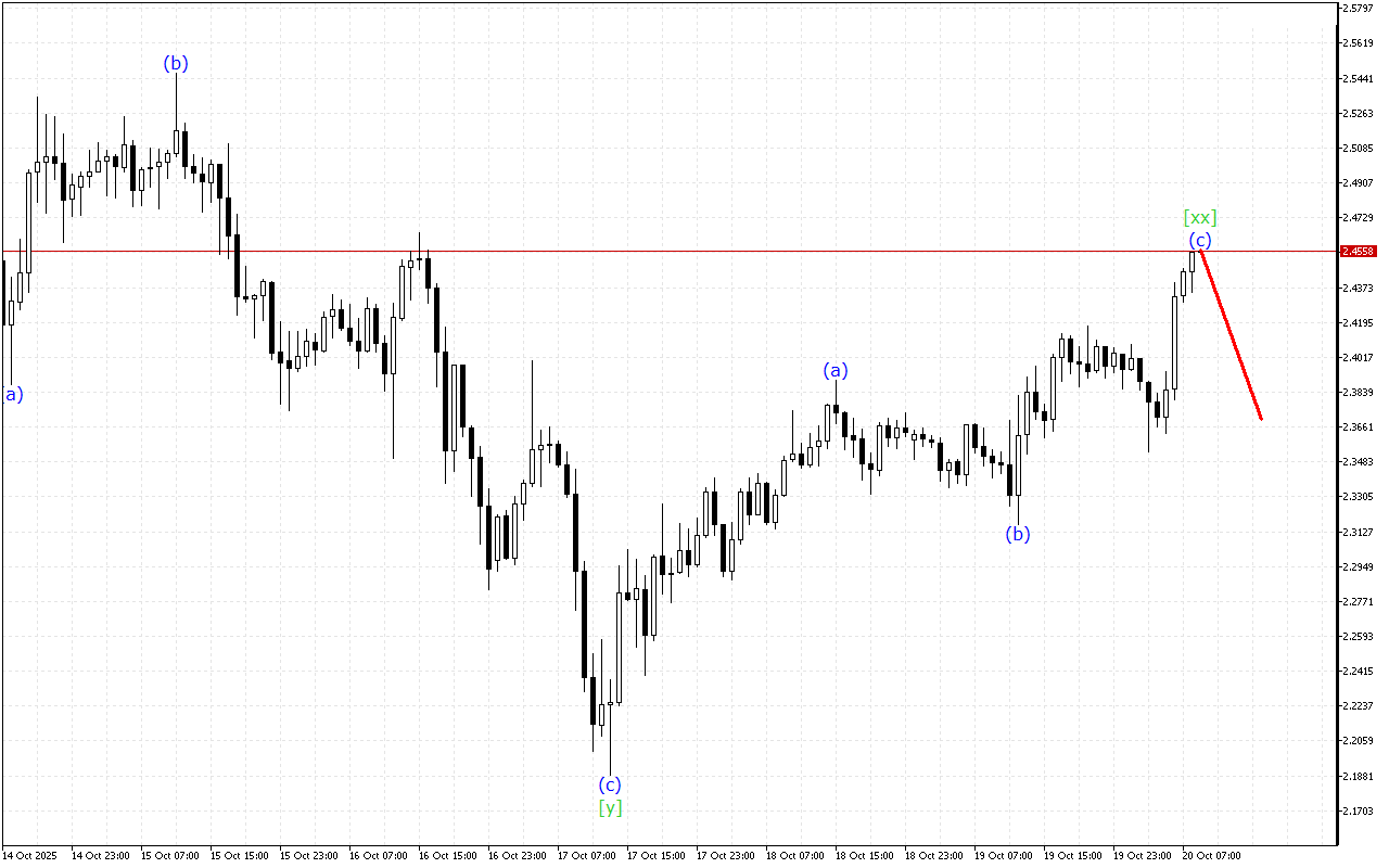 Існує розвиток потрійної трихвильової структури на більш високому таймфрейме. Наразі сформована хвиля [xx]. Після цього ціна повинна відновити рух вниз.