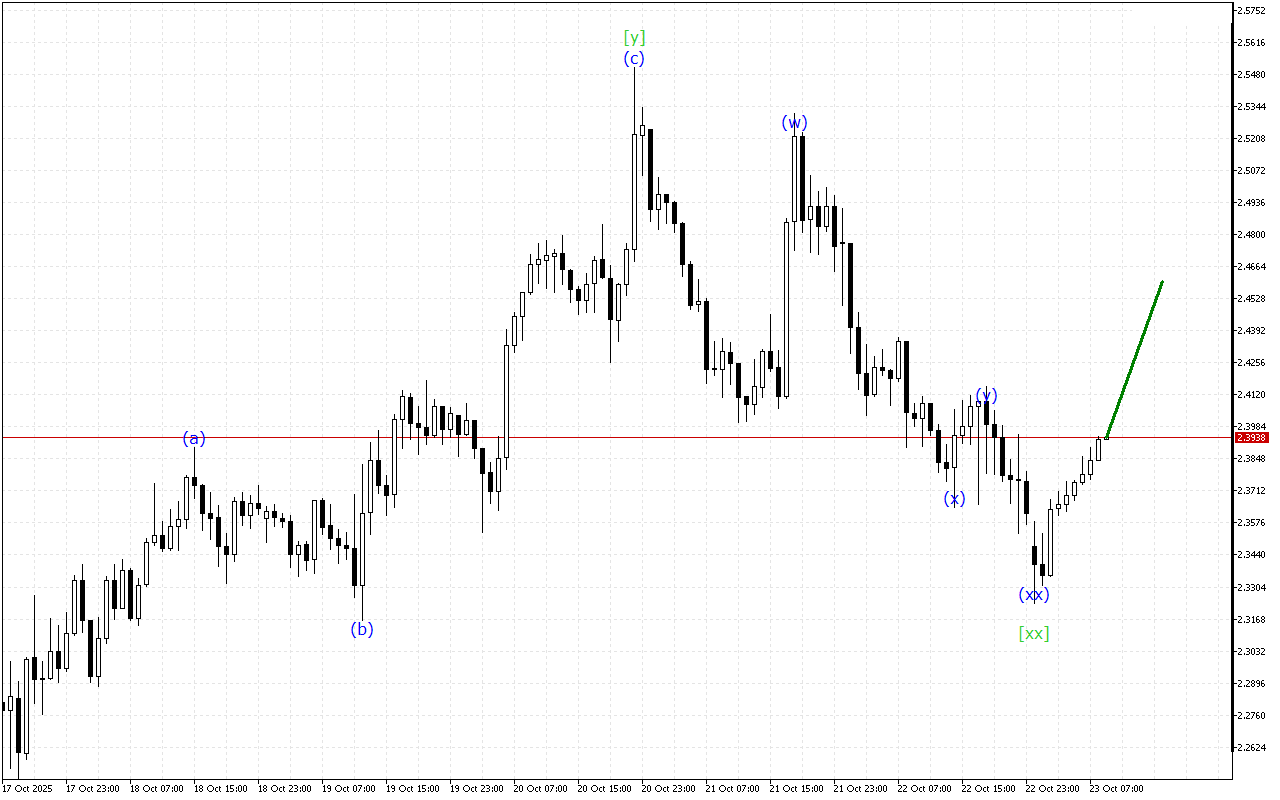 Хвилі нижнього таймфрейму утворюють потрійну трійку. Зараз ціна знаходиться у хвилі (z). Коли ця хвиля завершиться, очікується більш спрямований рух ціни.
