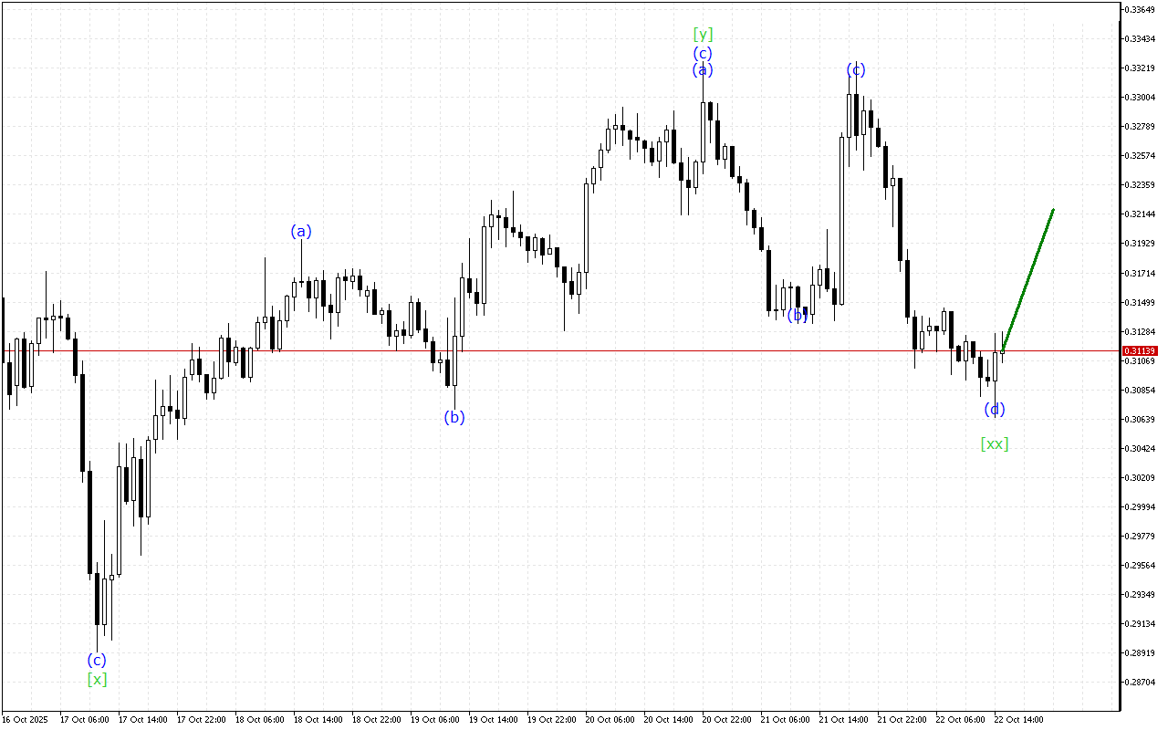 Хвилі нижчого ступеня вказують на утворення низхідного зигзага ABC. Хвиля (c) повинна бути вже завершена, тому можна очікувати формування нової хвильової структури.