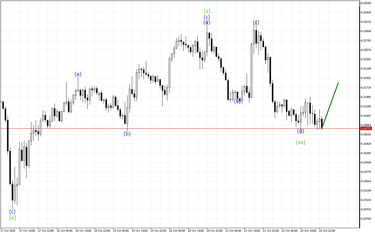 За меншим часовим масштабом ринок рухається в межах зигзага ABC. Зараз ціна, ймовірно, завершує формування хвилі (c), і рух ціни може перейти до формування нової хвилі.