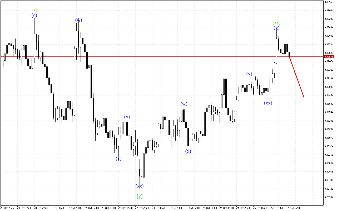 Існує розвиток потрійної трихвильової структури на більш високому таймфрейме. Наразі сформована хвиля [xx]. Після цього ціна повинна відновити рух вниз.