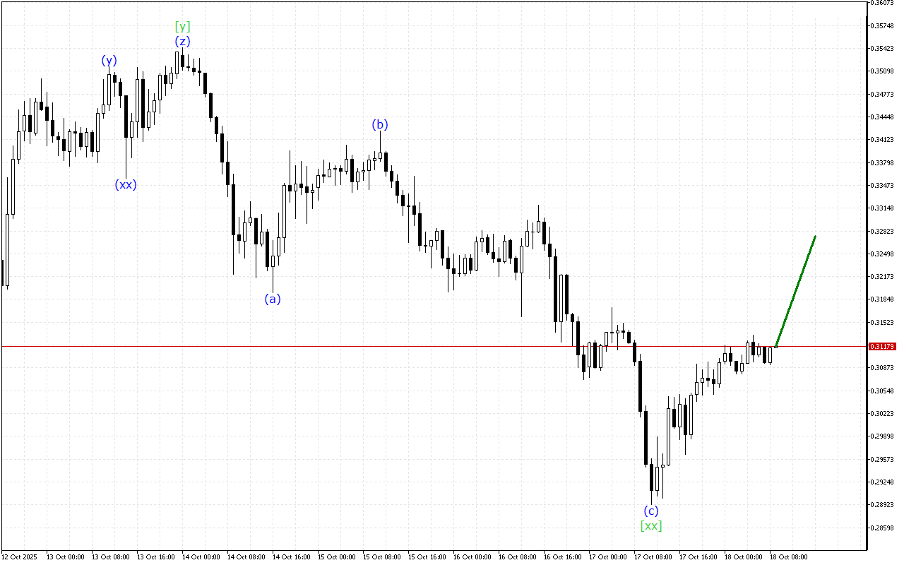 Хвилі нижчого ступеня вказують на утворення низхідного зигзага ABC. Хвиля (c) повинна бути вже завершена, тому можна очікувати формування нової хвильової структури.