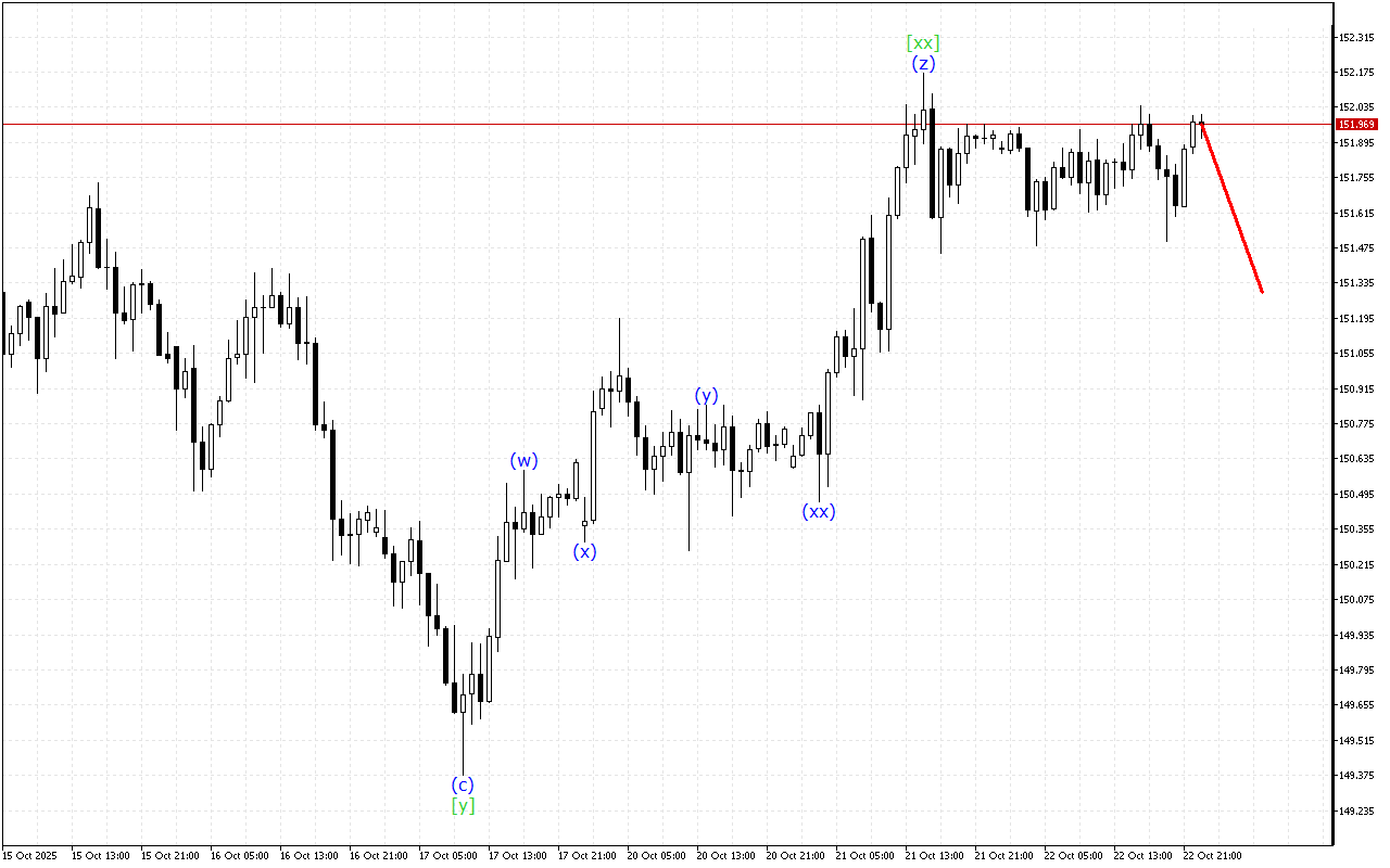 Існує розвиток потрійної трихвильової структури на більш високому таймфрейме. Наразі сформована хвиля [xx]. Після цього ціна повинна відновити рух вниз.
