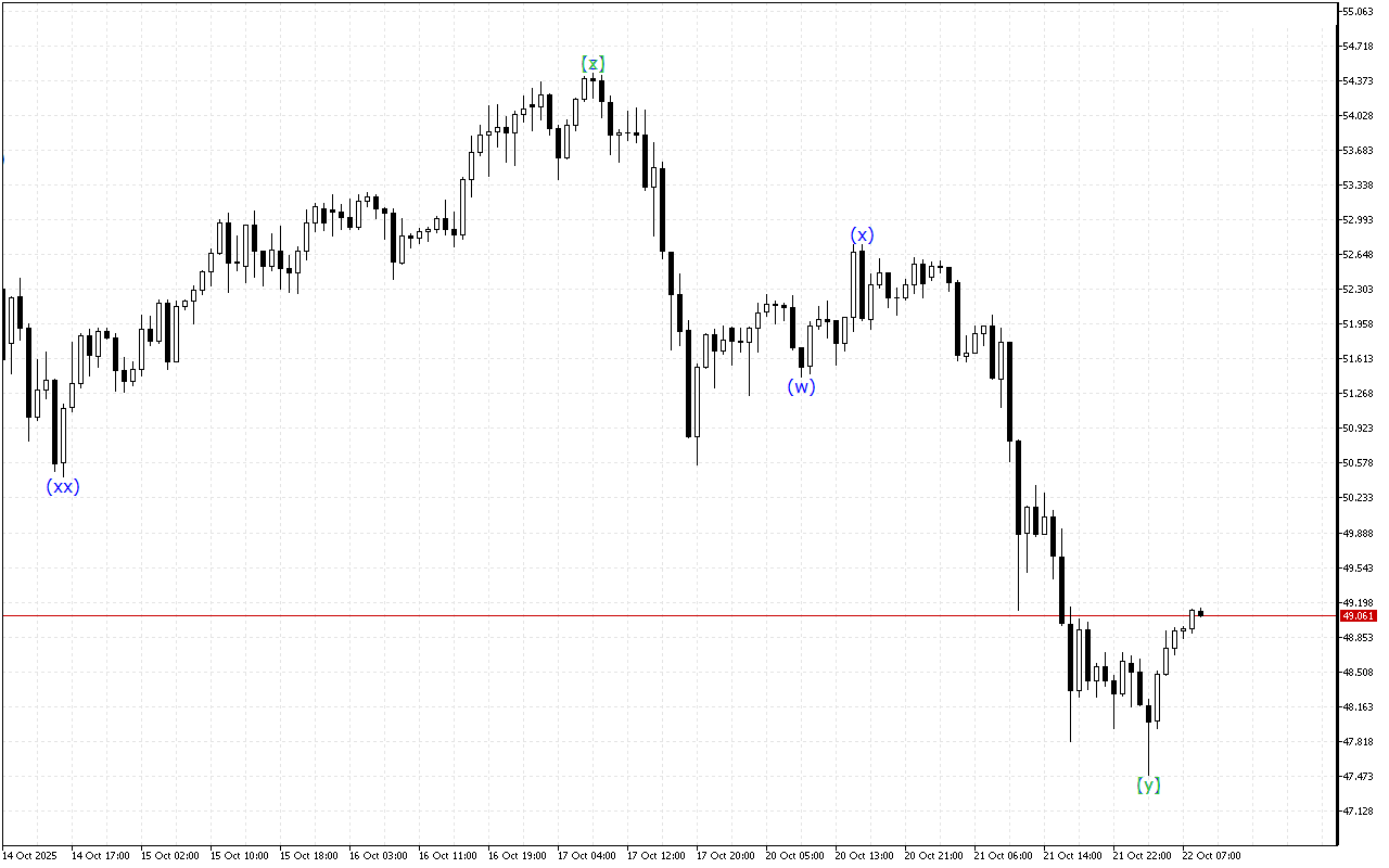 Аналіз структури вищої хвилі показує формування подвійної трійки WXY з розвитком кінцевої хвилі [y]. Після цього можна очікувати розвиток більш спрямованого руху ціни або формування більш складної п’ятихвильової структури.