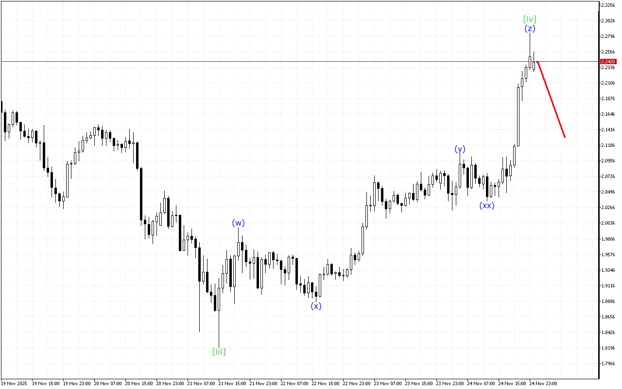 Аналіз хвильової структури вищого ступеня показує спадаючий клин. У рамках цієї п’ятихвильової формації завершується формування хвилі [iv] і очікується відновлення низхідного руху в межах хвилі [v].
