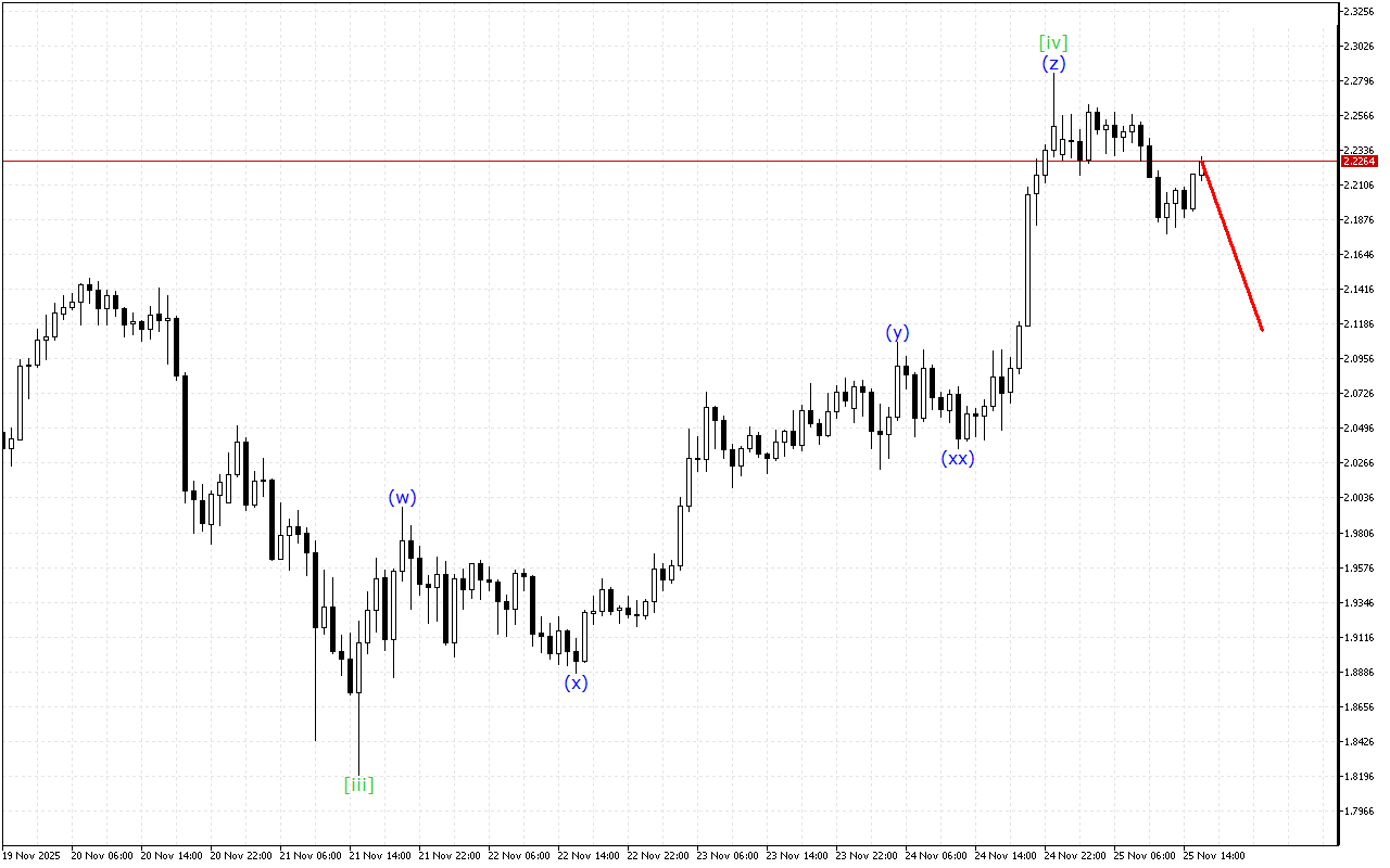 При хвильовій структурі нижчого ступеня відзначається утворення потрійної трійки. Зараз ціна знаходиться в хвилі (z), яка завершує це формування. Очікується, що найближчим часом ця хвиля закінчиться. Після цього поточна цінова тенденція може змінитися.