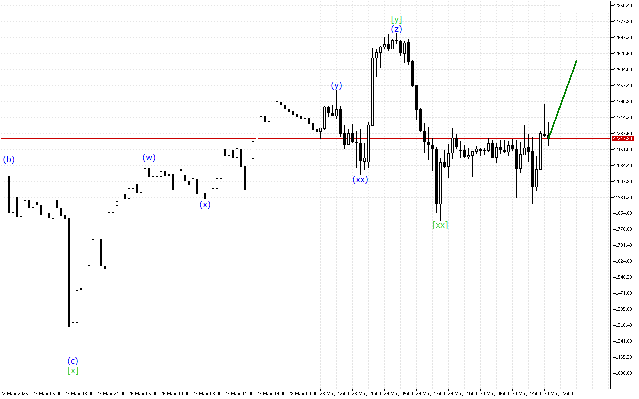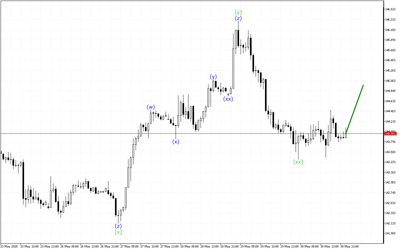 Хвилі нижнього таймфрейму утворюють потрійну трійку. Зараз ціна знаходиться у хвилі (z). Коли ця хвиля завершиться, очікується більш спрямований рух ціни.