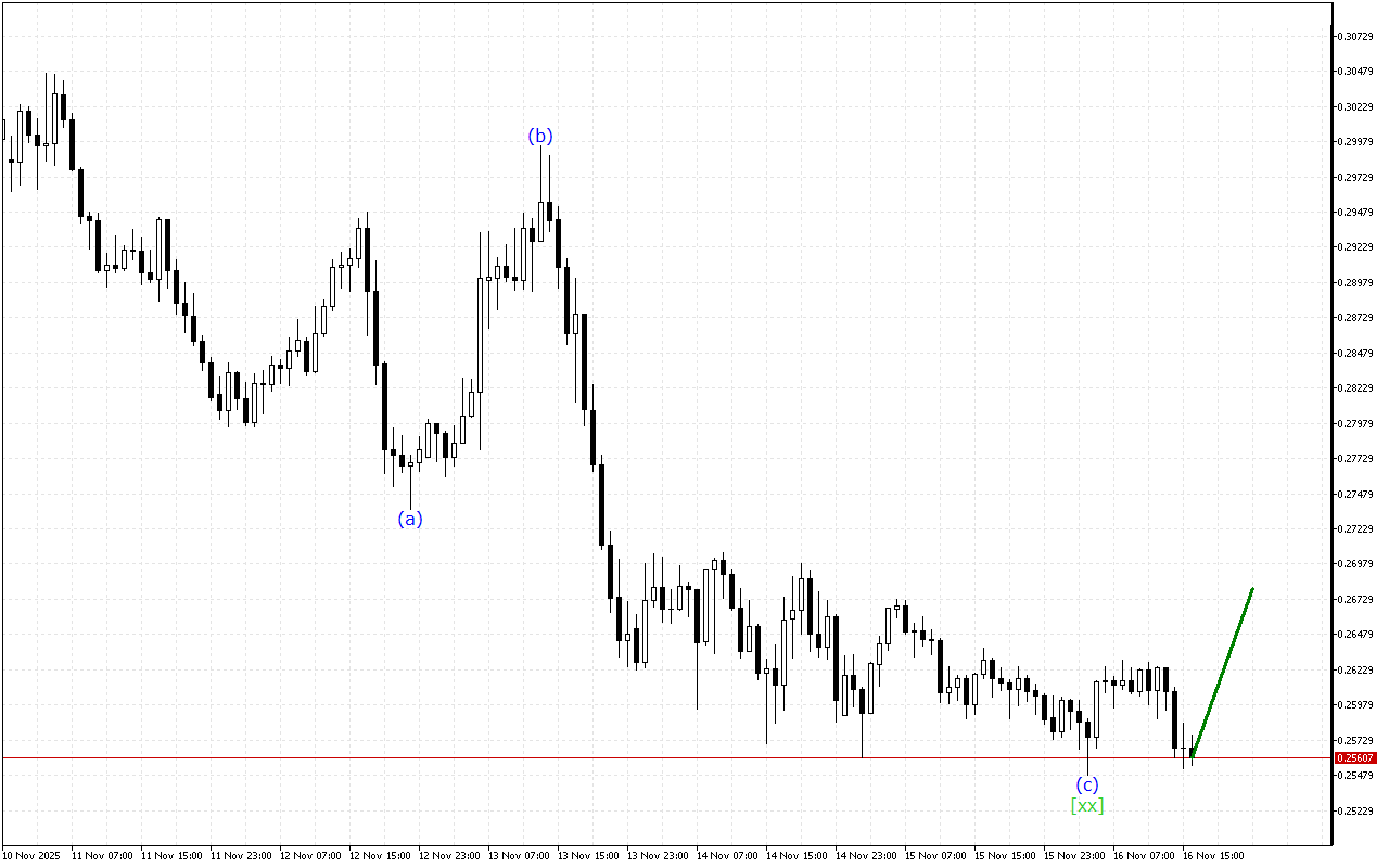 Хвилі нижчого ступеня вказують на утворення низхідного зигзага ABC. Хвиля (c) повинна бути вже завершена, тому можна очікувати формування нової хвильової структури.