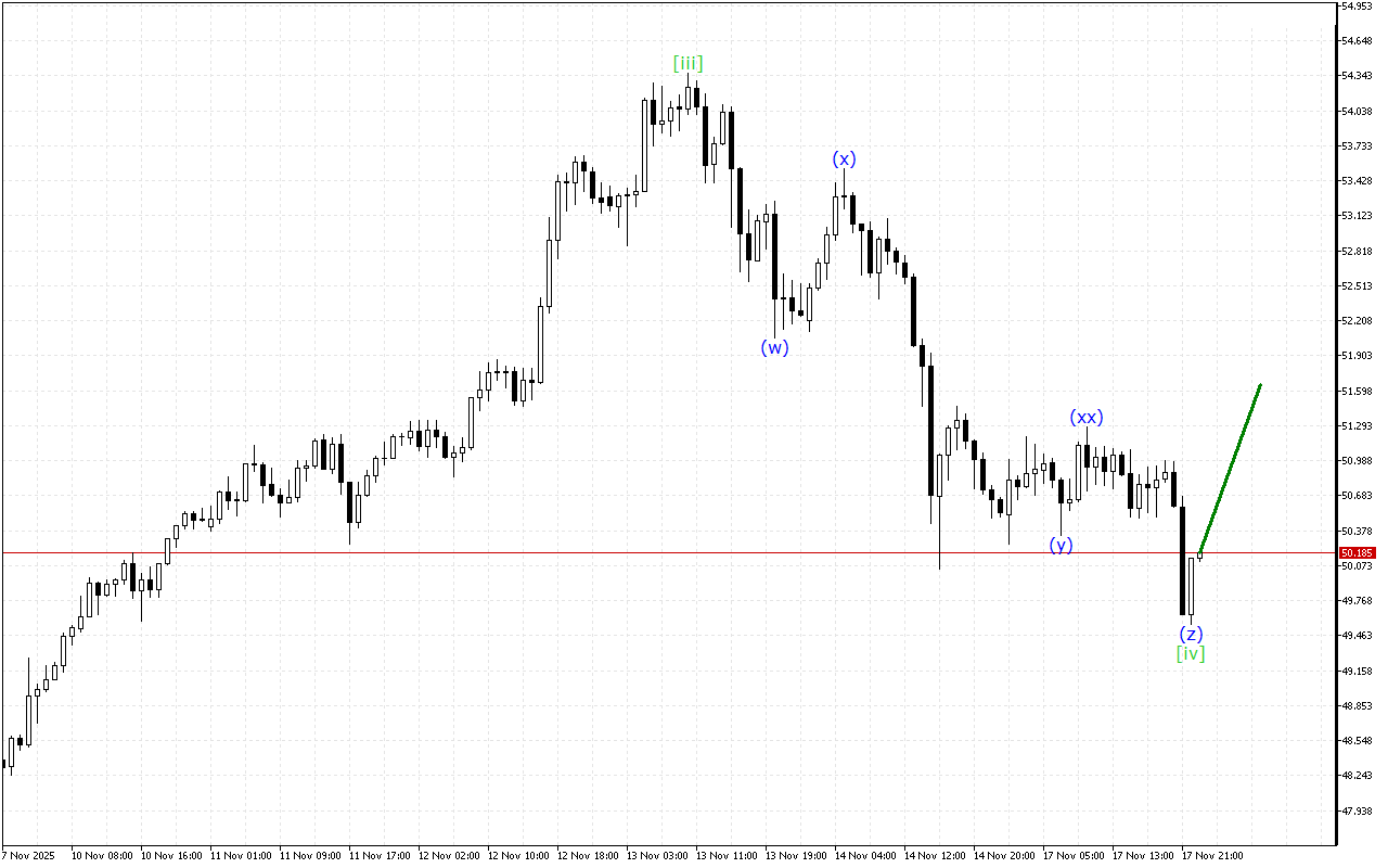 Хвилі нижнього таймфрейму утворюють потрійну трійку. Зараз ціна знаходиться у хвилі (z). Коли ця хвиля завершиться, очікується більш спрямований рух ціни.