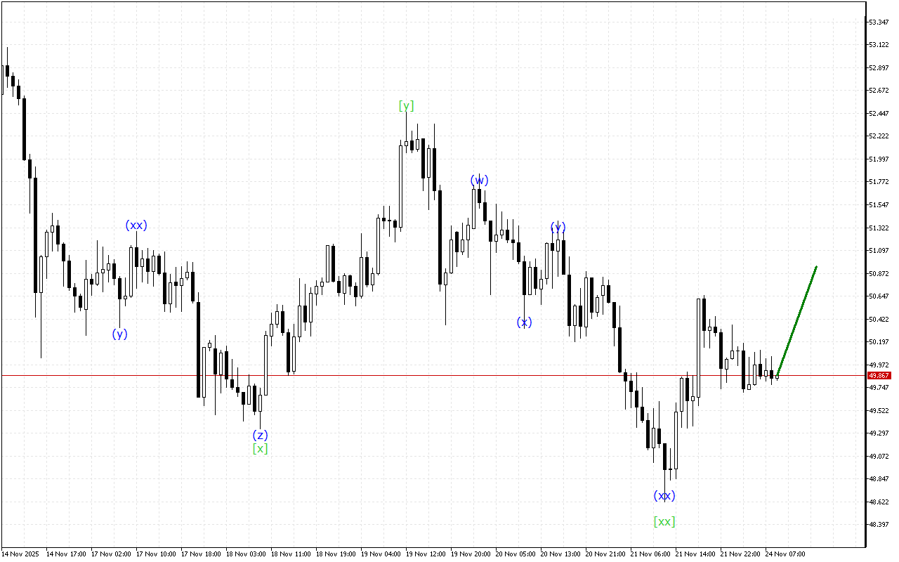 Хвилі нижнього таймфрейму утворюють потрійну трійку. Зараз ціна знаходиться у хвилі (z). Коли ця хвиля завершиться, очікується більш спрямований рух ціни.