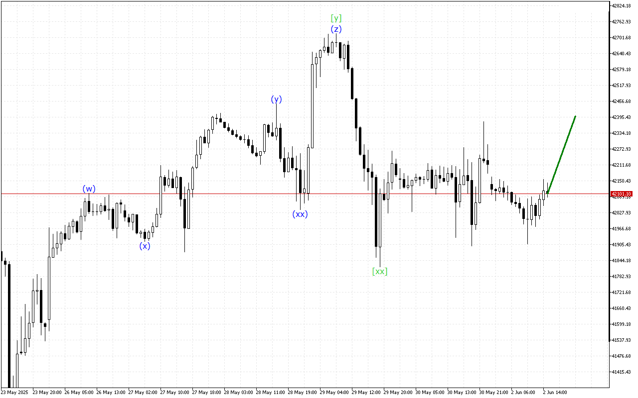 Середньостроковий вектор руху Dow Jones вказує на формування структури потрійних трьох хвиль. Зараз завершено формування хвилі [xx] і очікується початок висхідного руху в межах хвилі [z].