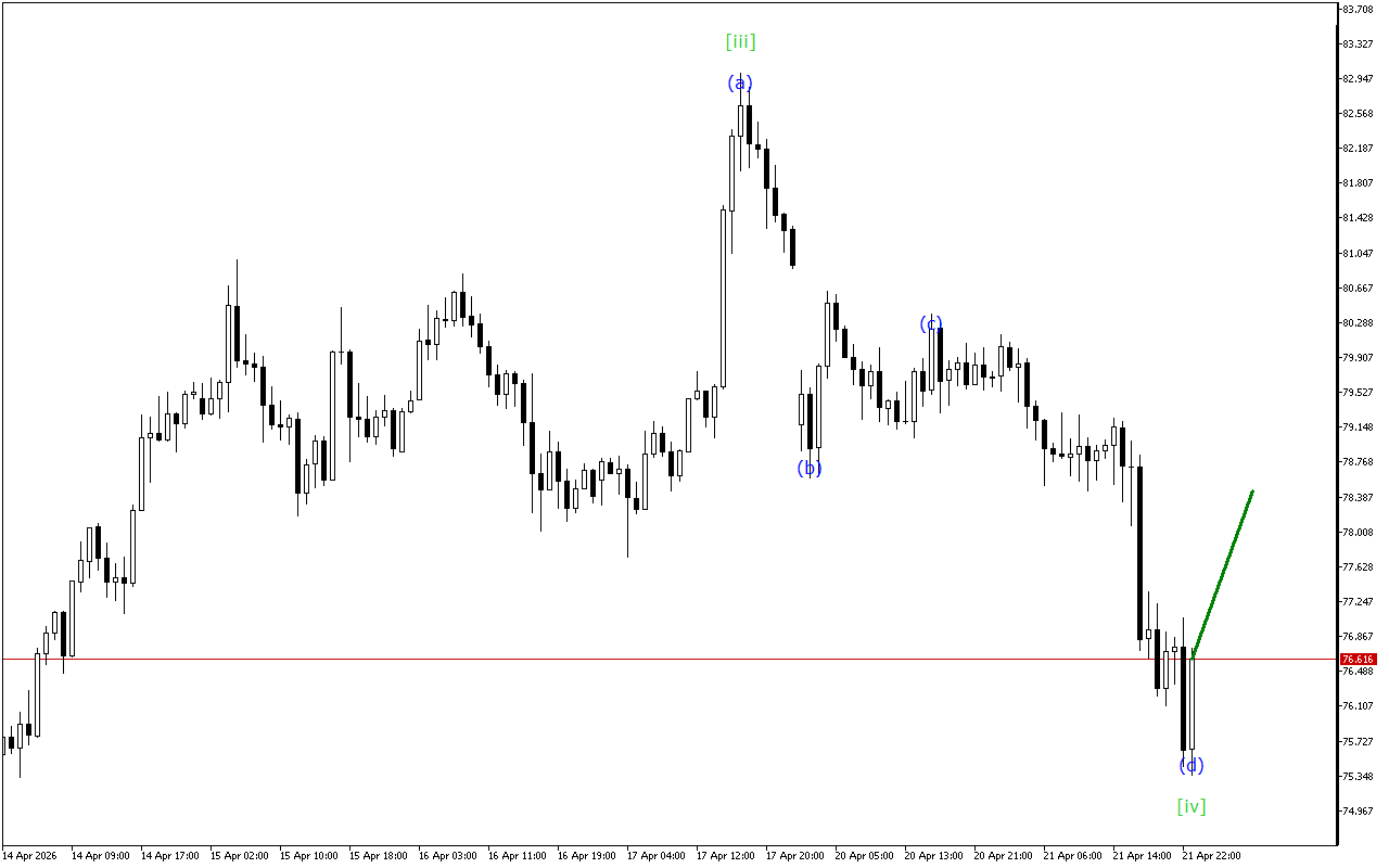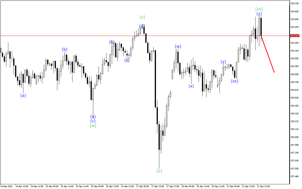 Існує розвиток потрійної трихвильової структури на більш високому таймфрейме. Наразі сформована хвиля [xx]. Після цього ціна повинна відновити рух вниз.