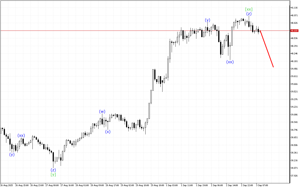 Хвилі нижчого ступеня вказують на утворення низхідного зигзага ABC. Хвиля (c) повинна бути вже завершена, тому можна очікувати формування нової хвильової структури.