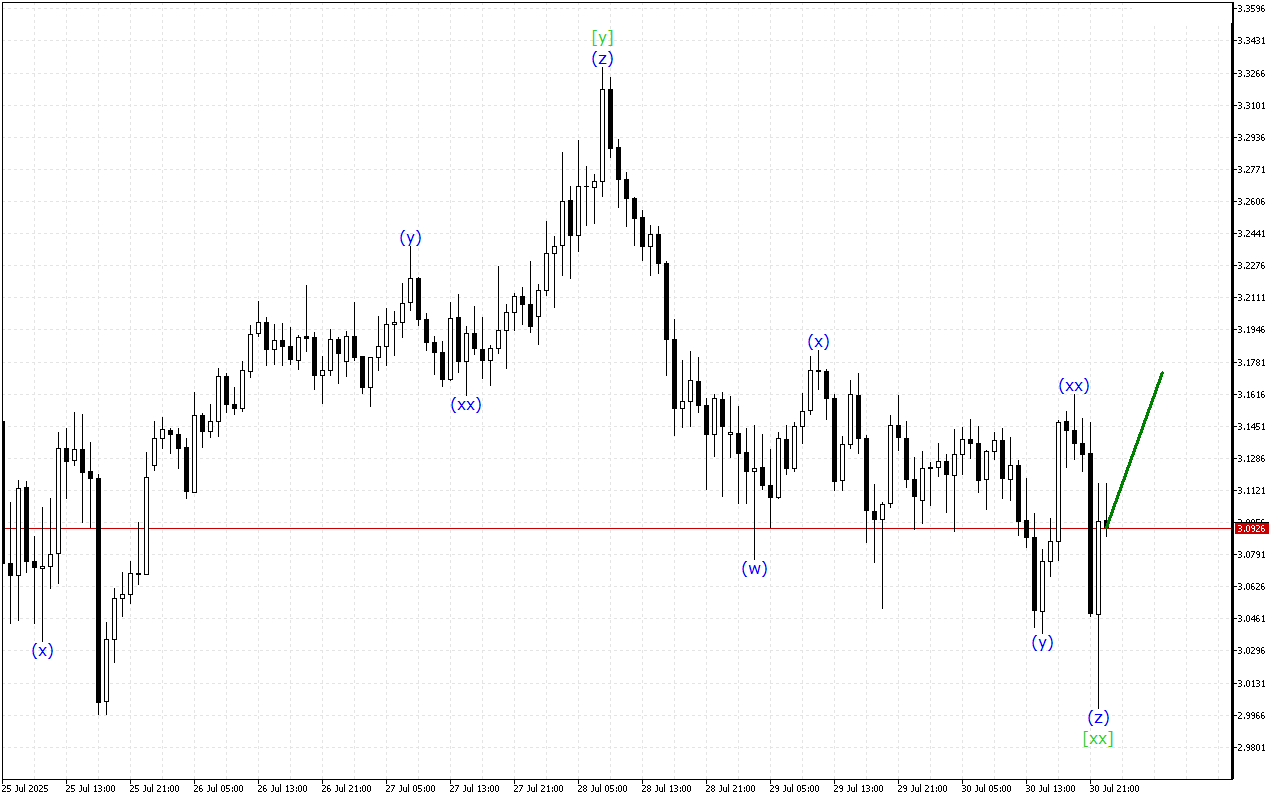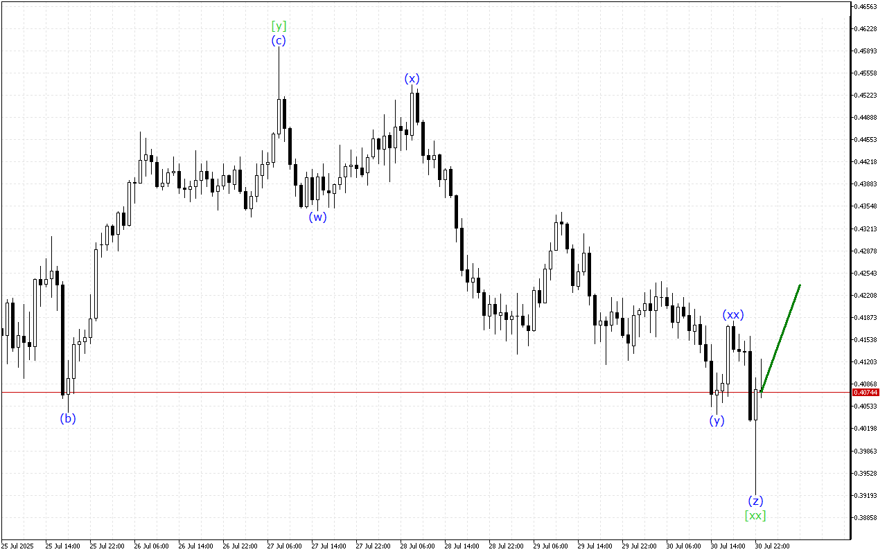 Хвилі нижнього таймфрейму утворюють потрійну трійку. Зараз ціна знаходиться у хвилі (z). Коли ця хвиля завершиться, очікується більш спрямований рух ціни.