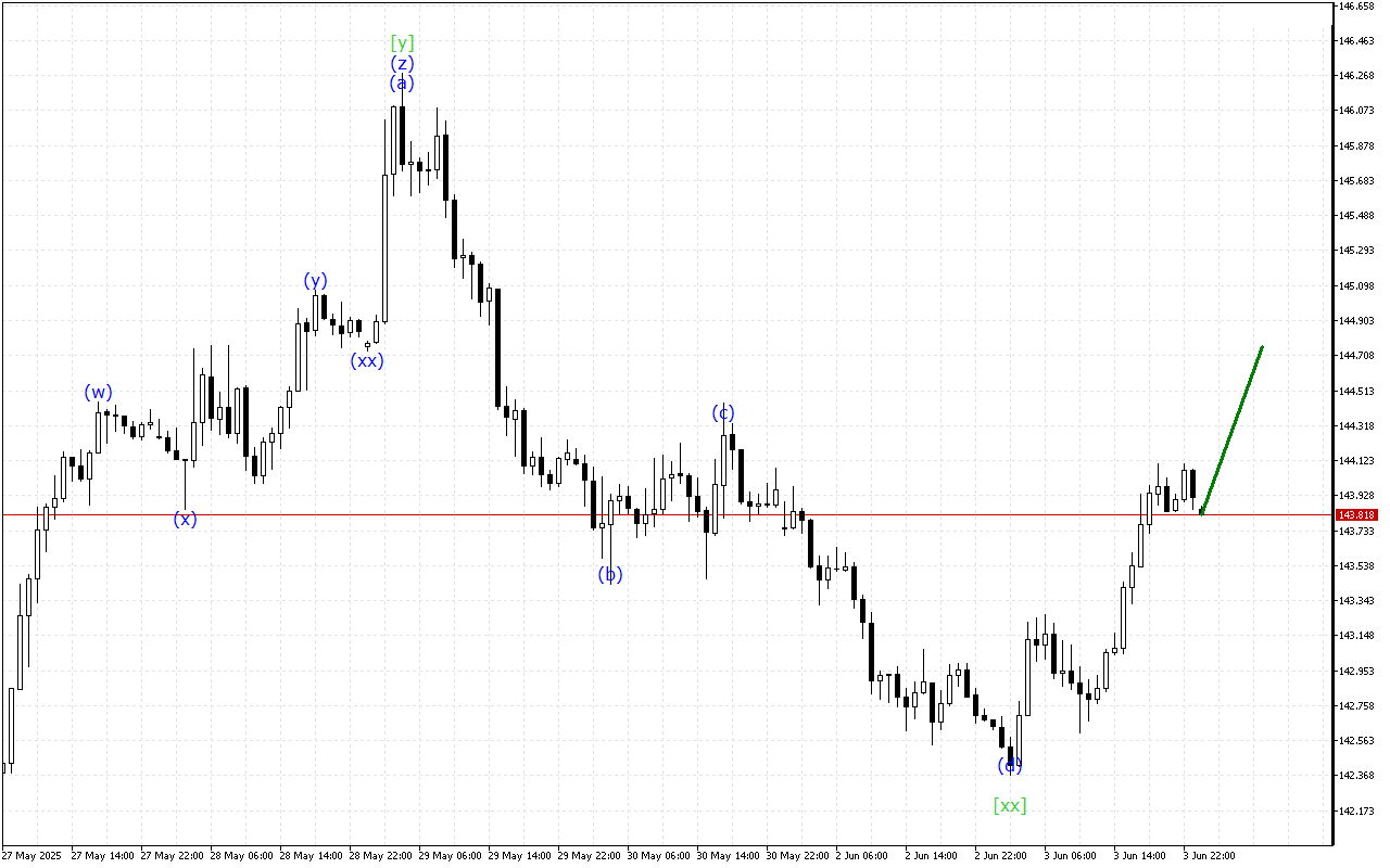 Середньостроковий вектор руху USDJPY вказує на формування структури потрійних трьох хвиль. Зараз завершено формування хвилі [xx] і очікується початок висхідного руху в межах хвилі [z].