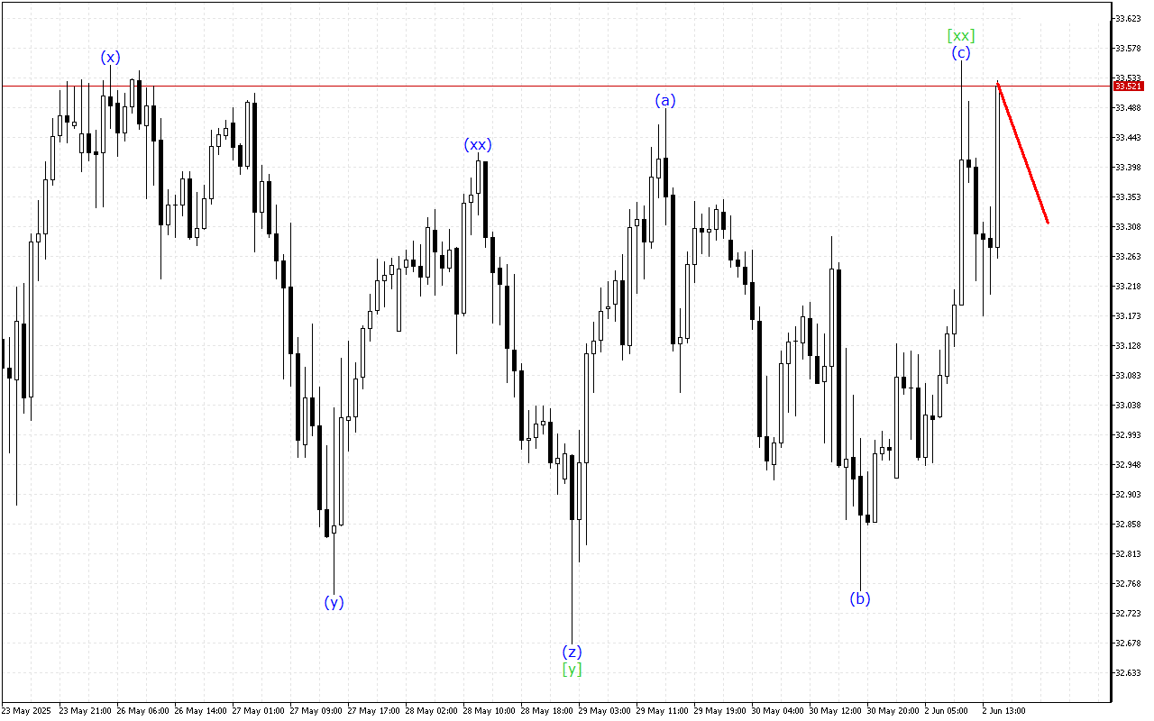 Існує розвиток потрійної трихвильової структури на більш високому таймфрейме. Наразі сформована хвиля [xx]. Після цього ціна повинна відновити рух вниз.
