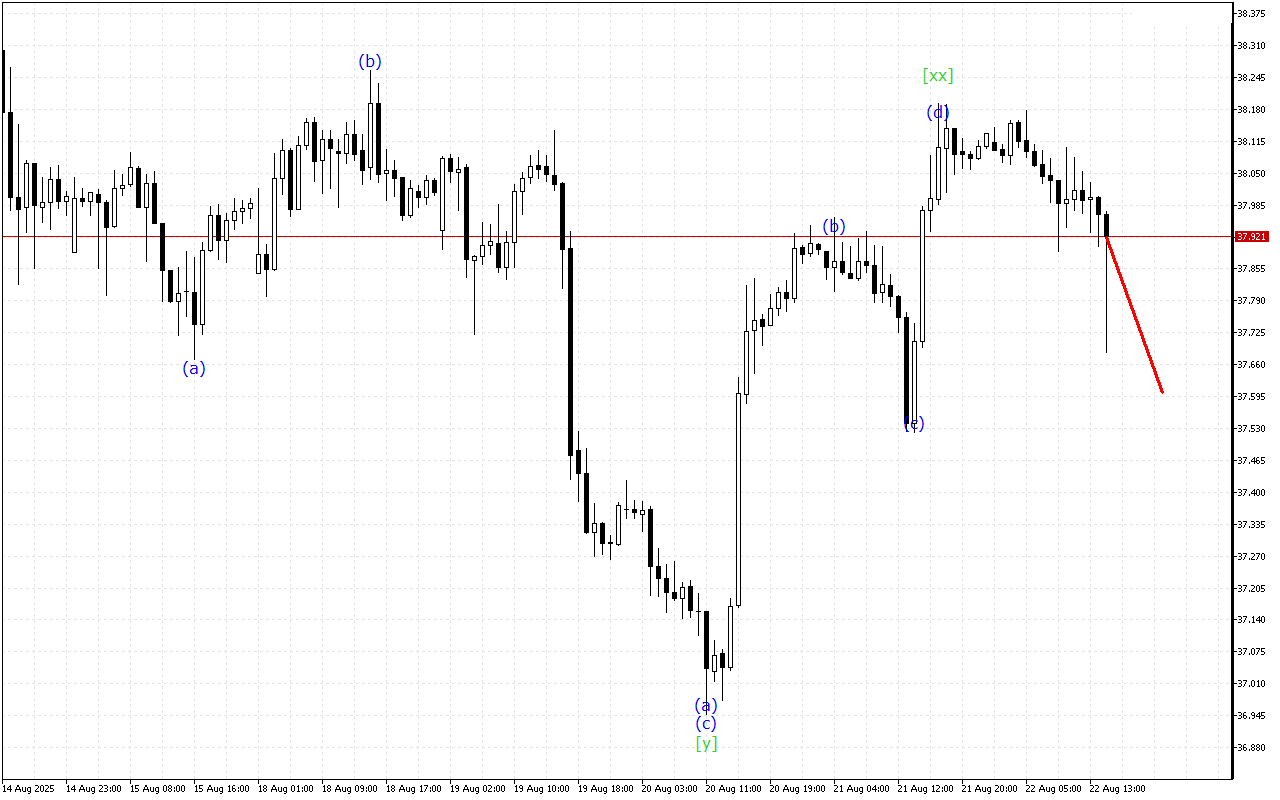 XAGUSD продовжує рухатися в структурі хвилі “Потрійної Трійки“. Зараз, мабуть, на графіку завершилося формування хвилі [xx] і можна очікувати розвитку висхідного руху з хвилею [z].