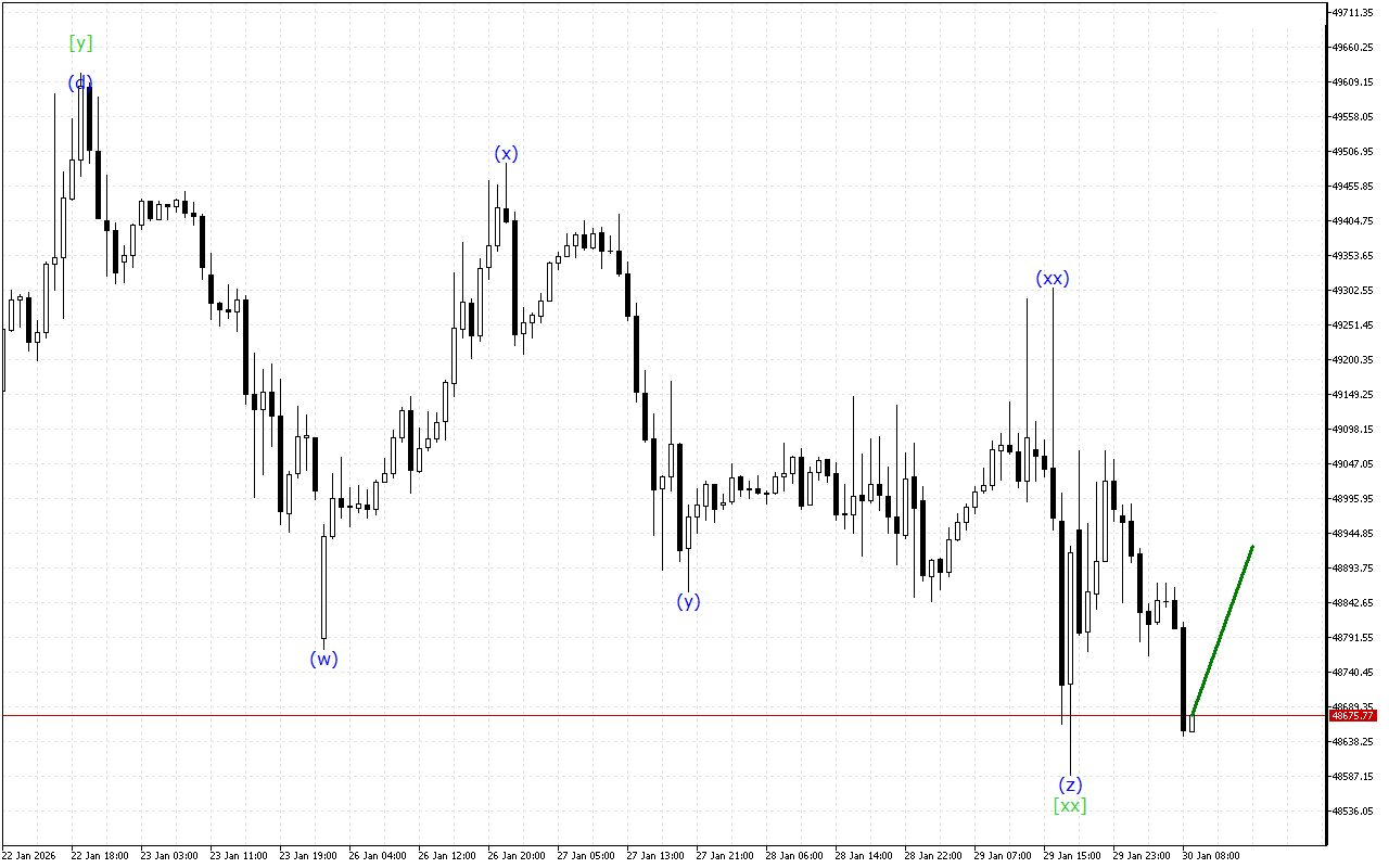 Хвилі нижнього таймфрейму утворюють потрійну трійку. Зараз ціна знаходиться у хвилі (z). Коли ця хвиля завершиться, очікується більш спрямований рух ціни.