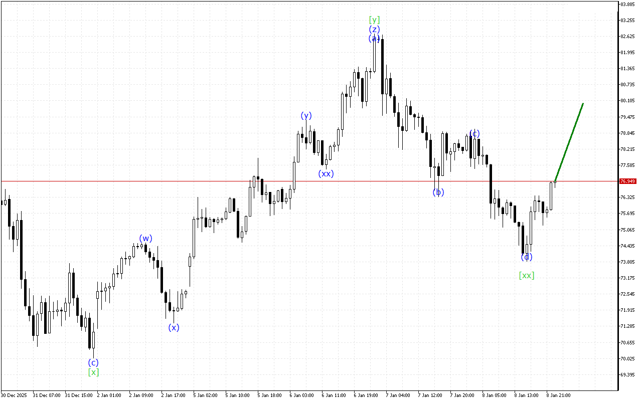 Середньостроковий вектор руху XAGUSD вказує на формування структури потрійних трьох хвиль. Зараз завершено формування хвилі [xx] і очікується початок висхідного руху в межах хвилі [z].