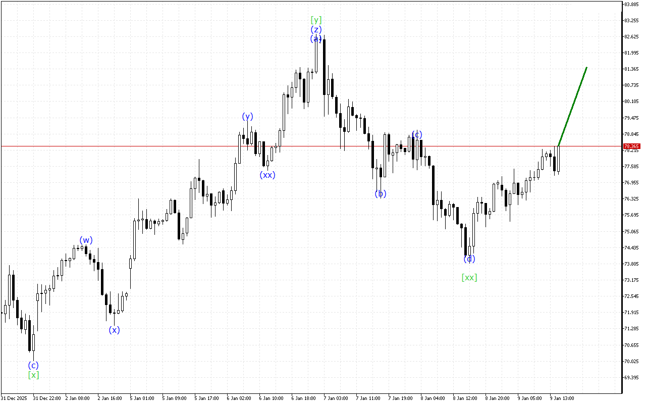Середньостроковий вектор руху XAGUSD вказує на формування структури потрійних трьох хвиль. Зараз завершено формування хвилі [xx] і очікується початок висхідного руху в межах хвилі [z].