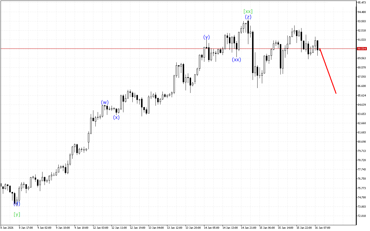 Існує розвиток потрійної трихвильової структури на більш високому таймфрейме. Наразі сформована хвиля [xx]. Після цього ціна повинна відновити рух вниз.