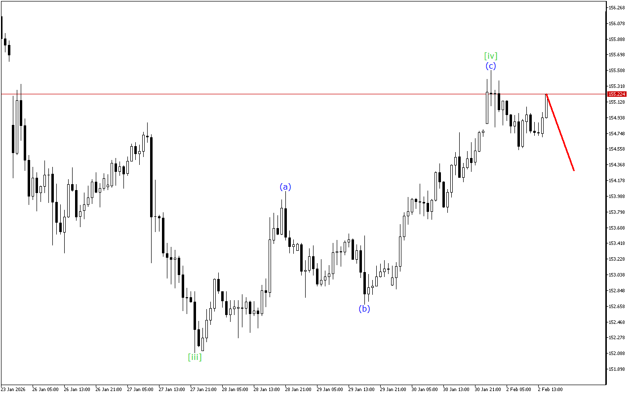 На більш високому інтервалі часу спостерігається формування неповного спадного імпульсу. Наразі в рамках цієї структури сформувалася коригувальна хвиля [iv]. Слідом за ним має бути спадна імпульсна хвиля [v].