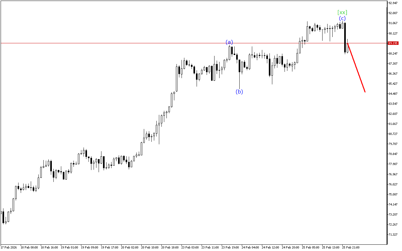 Існує розвиток потрійної трихвильової структури на більш високому таймфрейме. Наразі сформована хвиля [xx]. Після цього ціна повинна відновити рух вниз.
