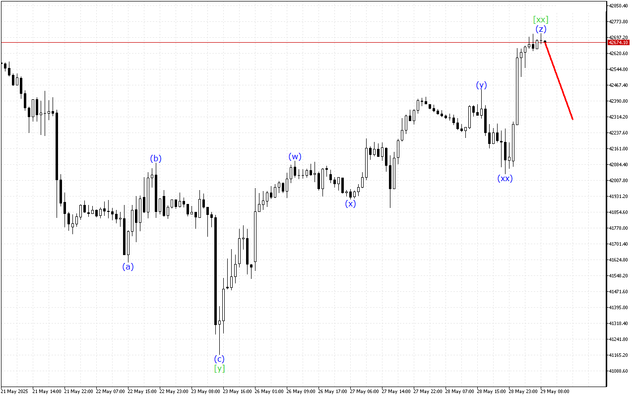Σε μια κυματική δομή χαμηλότερου βαθμού, σημειώνεται ο σχηματισμός τριπλού τριαριών. Τώρα η τιμή βρίσκεται στο κύμα (z), που ολοκληρώνει τον σχηματισμό. Αυτό το κύμα αναμένεται να τελειώσει στο άμεσο μέλλον. Μετά από αυτό, η τρέχουσα τάση των τιμών μπορεί να αλλάξει.