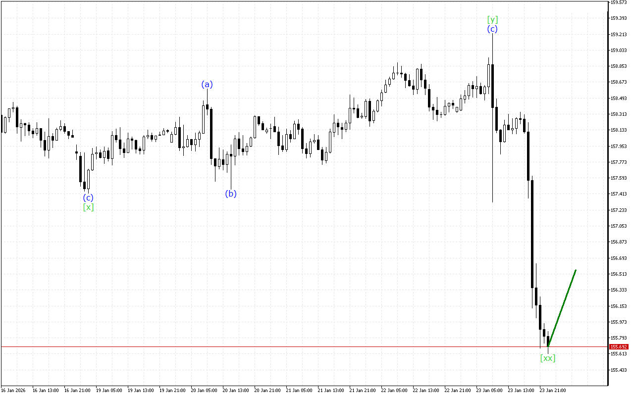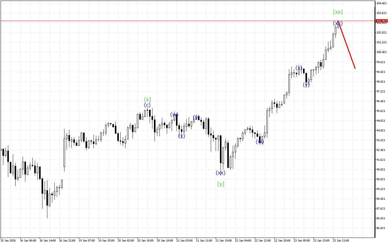 Σε μια κυματική δομή χαμηλότερου βαθμού, σημειώνεται ο σχηματισμός τριπλού τριαριών. Τώρα η τιμή βρίσκεται στο κύμα (z), που ολοκληρώνει τον σχηματισμό. Αυτό το κύμα αναμένεται να τελειώσει στο άμεσο μέλλον. Μετά από αυτό, η τρέχουσα τάση των τιμών μπορεί να αλλάξει.
