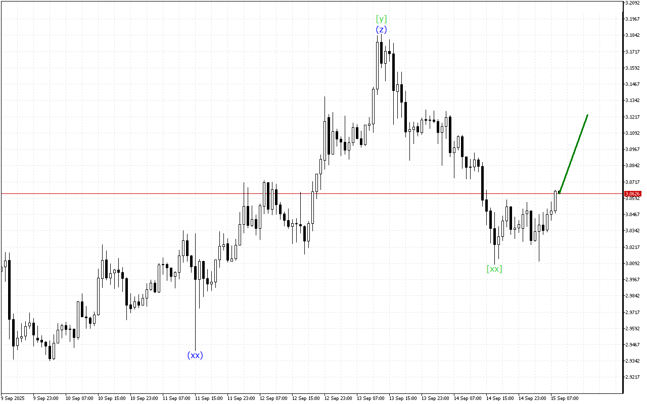 Σε μια κυματική δομή χαμηλότερου βαθμού, σημειώνεται ο σχηματισμός τριπλού τριαριών. Τώρα η τιμή βρίσκεται στο κύμα (z), που ολοκληρώνει τον σχηματισμό. Αυτό το κύμα αναμένεται να τελειώσει στο άμεσο μέλλον. Μετά από αυτό, η τρέχουσα τάση των τιμών μπορεί να αλλάξει.
