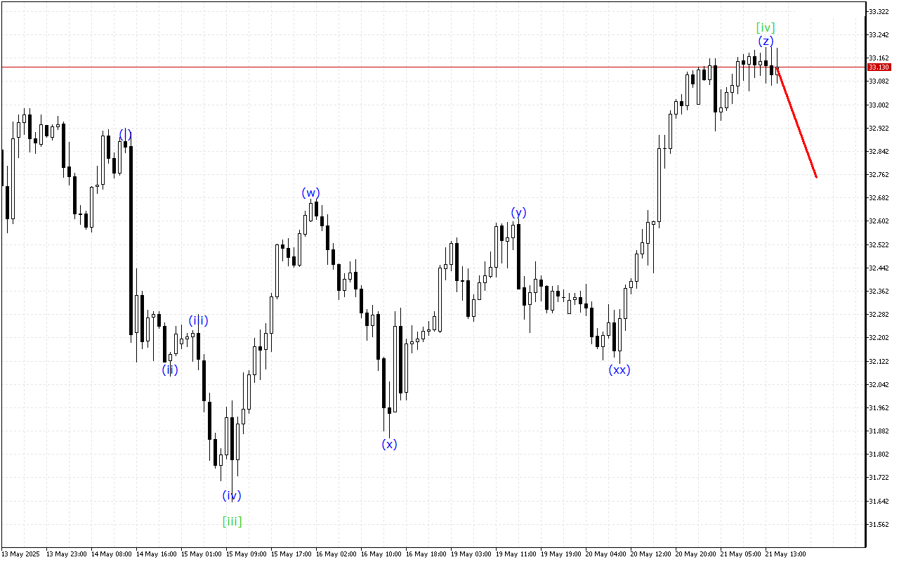 Σε μια κυματική δομή χαμηλότερου βαθμού, σημειώνεται ο σχηματισμός τριπλού τριαριών. Τώρα η τιμή βρίσκεται στο κύμα (z), που ολοκληρώνει τον σχηματισμό. Αυτό το κύμα αναμένεται να τελειώσει στο άμεσο μέλλον. Μετά από αυτό, η τρέχουσα τάση των τιμών μπορεί να αλλάξει.