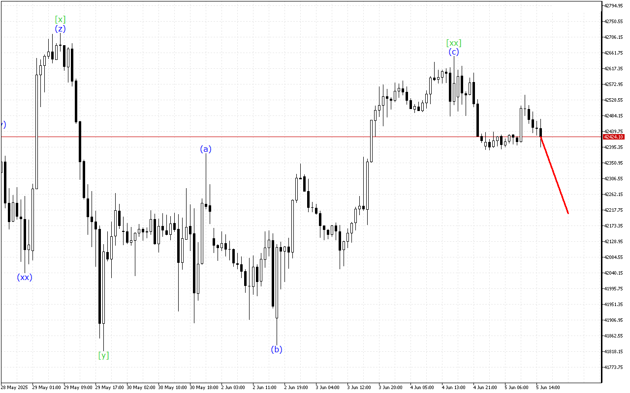 There is the development of a triple three wave structure on a higher time-frame. Currently, the wave [xx] has been formed. After this the price should resume its downward movement.