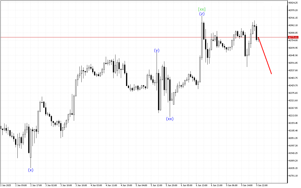 There is the development of a triple three wave structure on a higher time-frame. Currently, the wave [xx] has been formed. After this the price should resume its downward movement.
