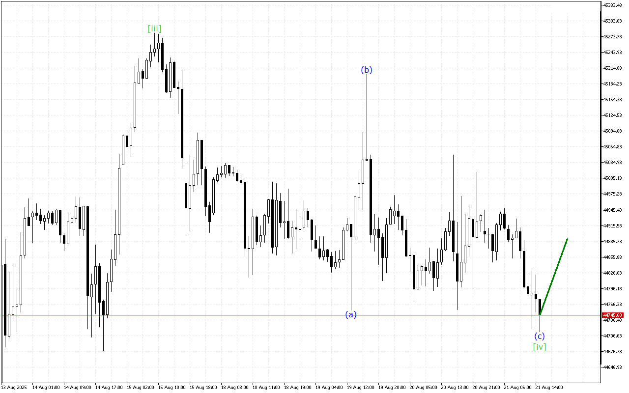 Lower-degree waves indicate the formation of a downward ABC zigzag. The wave (c) must have already been completed, so the formation of a new wave structure can be expected.