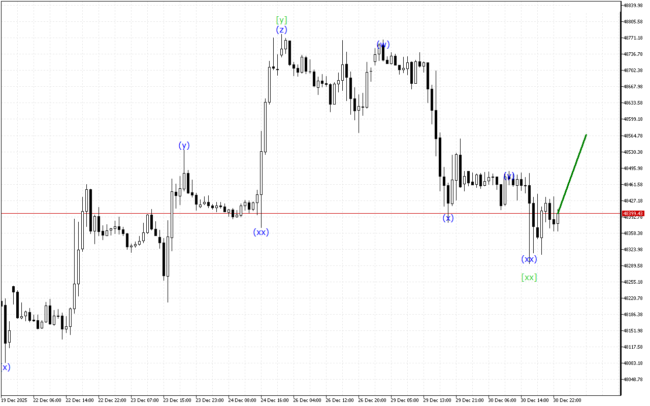 Vektor pergerakan jangka menengah Dow Jones menunjukkan pembentukan struktur gelombang Triple Three. Saat ini pembentukan gelombang [xx] telah selesai dan diharapkan akan dimulainya pergerakan ke atas dalam gelombang [z].