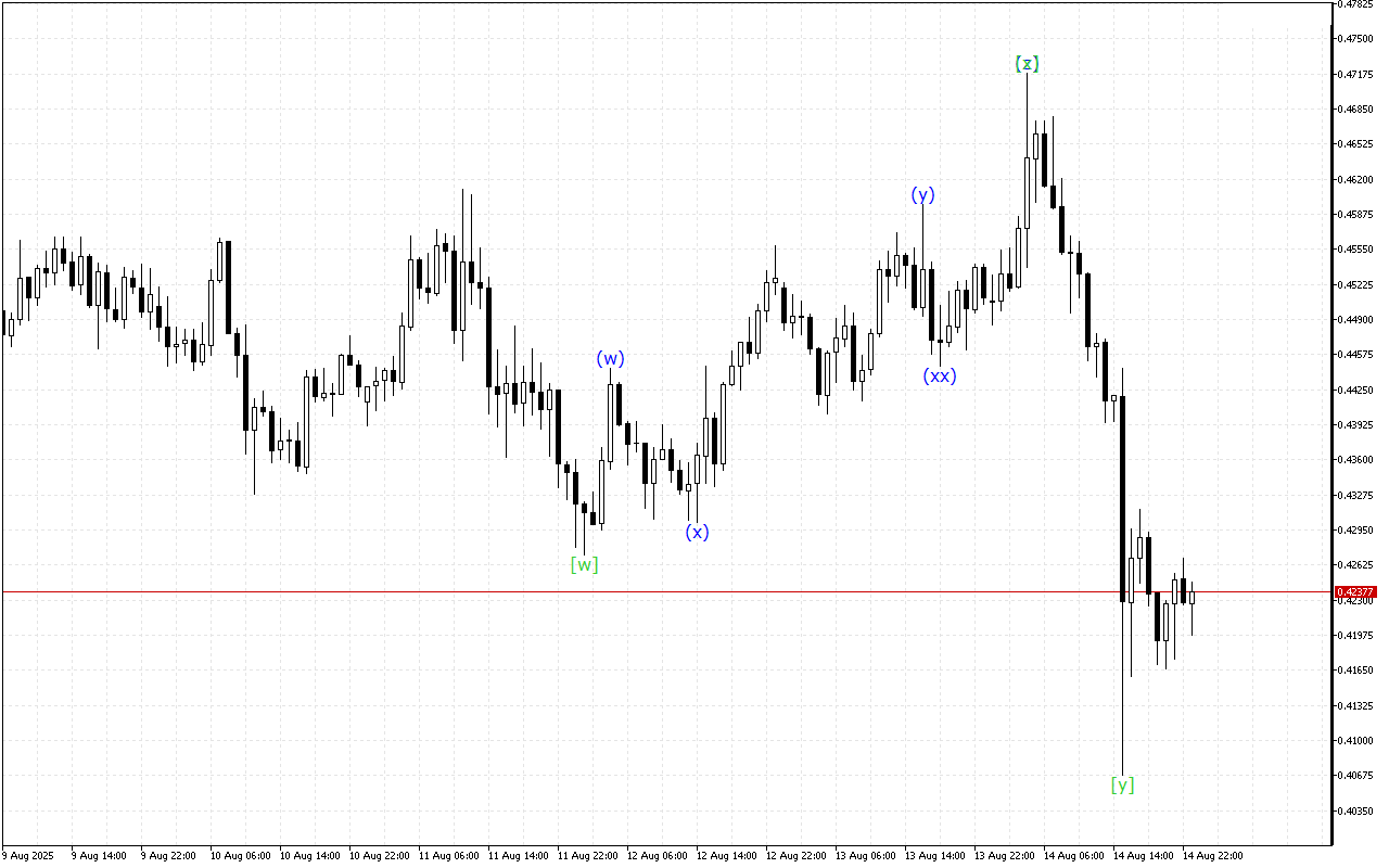 Dalam konteks struktur gelombang tingkat lebih rendah, pembentukan zigzag ABC terlihat jelas. Setelah gelombang (c) terbentuk sepenuhnya, dimulainya kembali pergerakan tren dapat diamati.