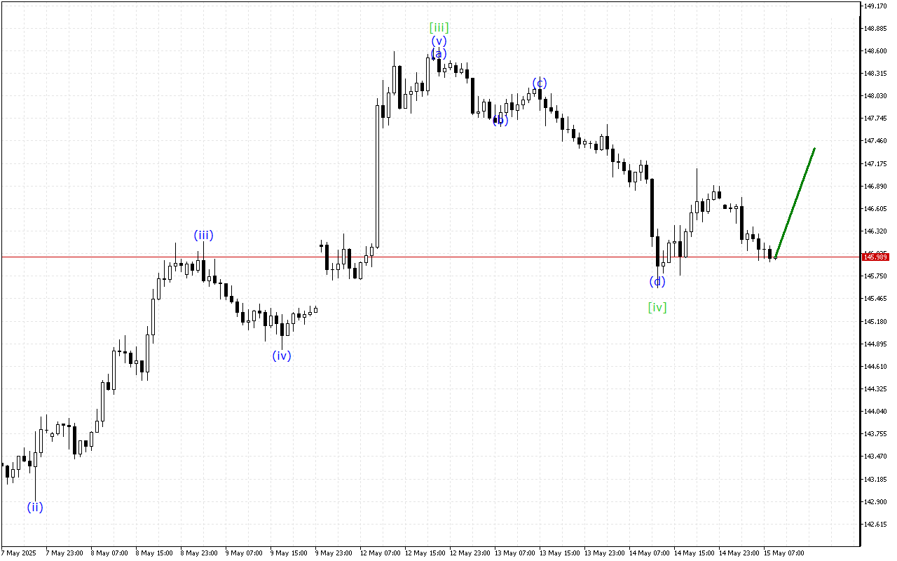 Pada interval waktu yang lebih tinggi, wedge naik terus terbentuk. Gelombang korektif ke bawah [iv] telah terbentuk dalam pergerakan ini pada saat ini. Setelah gelombang ini selesai, pembentukan gelombang ke atas [v] akan terlihat.