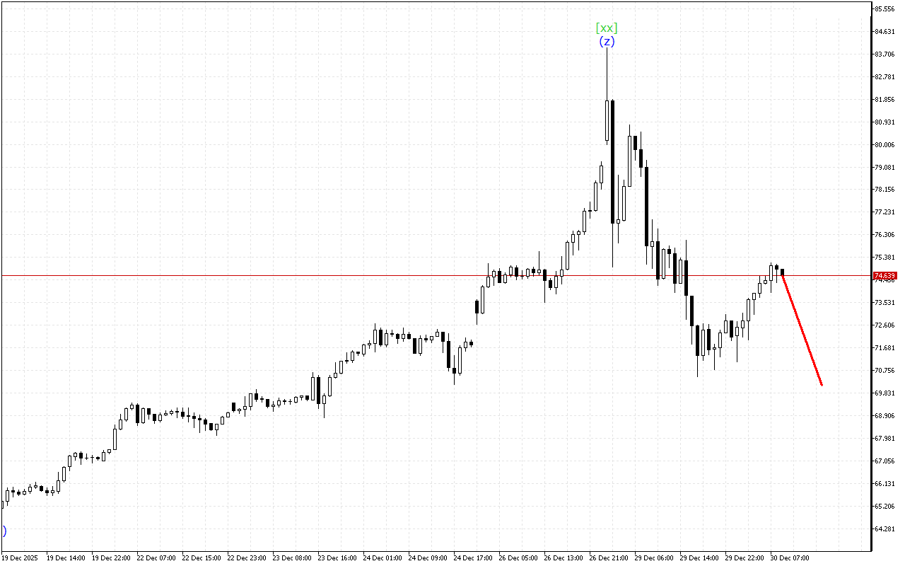 Dalam struktur gelombang tingkat lebih rendah, perkembangan triple three terlihat. Pembentukan gelombang (z) sedang diselesaikan dalam struktur ini. Terhadap latar belakang ini, penyelesaian koreksi dan awal pergerakan yang lebih terarah diperkirakan.