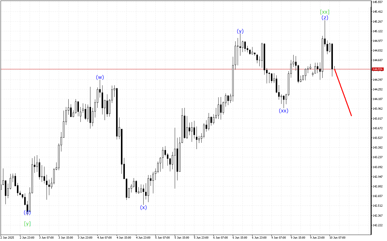 現在の動向は、トリプルスリーの形成を示しています。現時点では、波[xx]が形成されています。その形成後、下向きの波[z]の発展が予想されます。