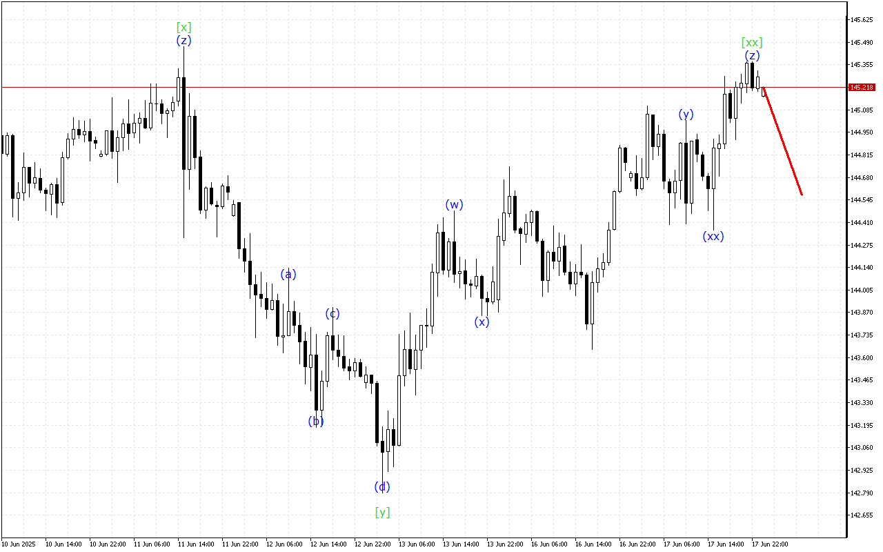 現在の動向は、トリプルスリーの形成を示しています。現時点では、波[xx]が形成されています。その形成後、下向きの波[z]の発展が予想されます。
