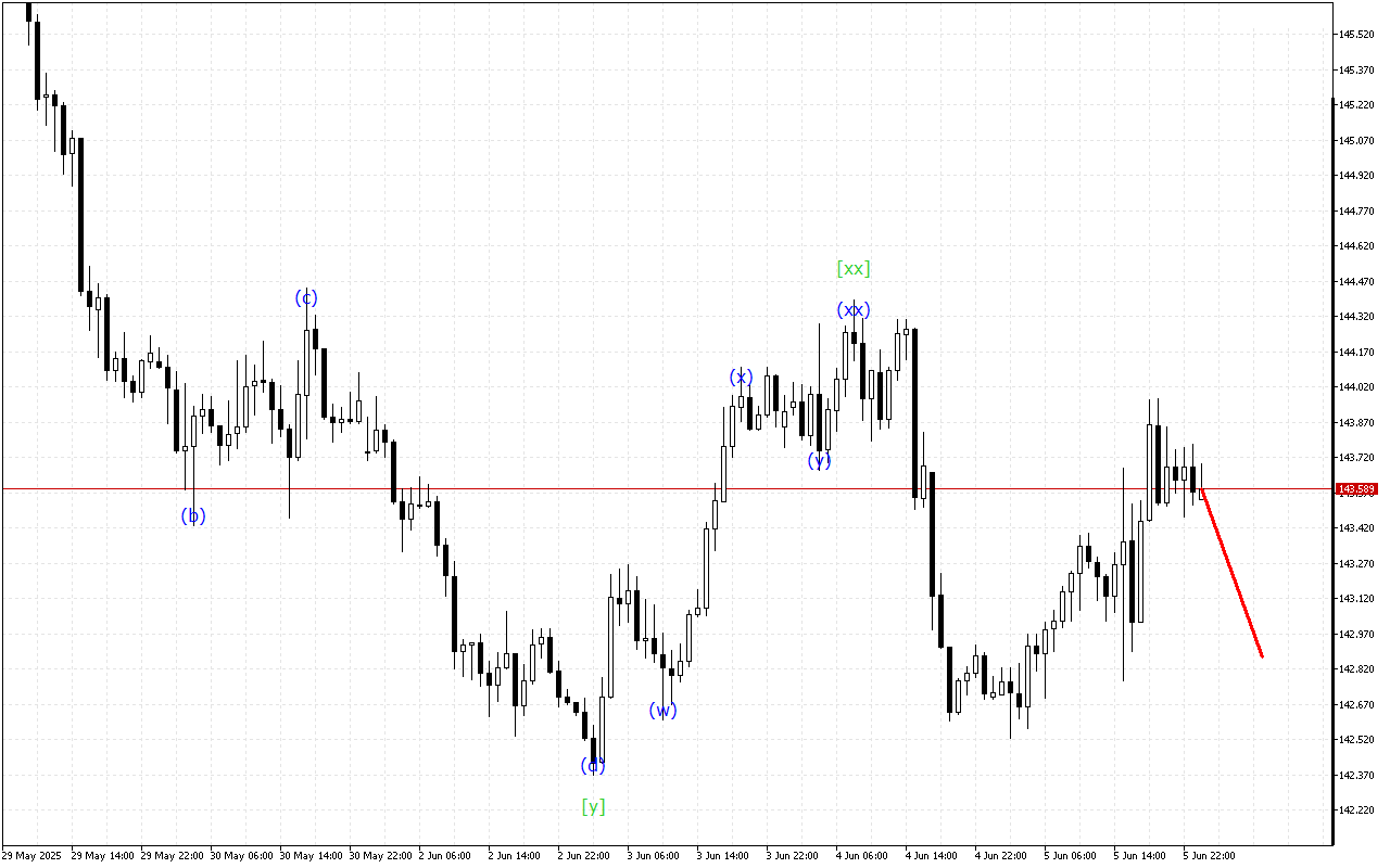 現在の動向は、トリプルスリーの形成を示しています。現時点では、波[xx]が形成されています。その形成後、下向きの波[z]の発展が予想されます。