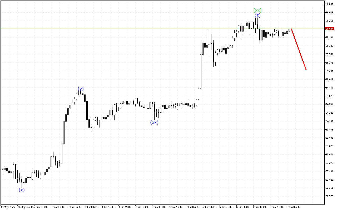 現在の動向は、トリプルスリーの形成を示しています。現時点では、波[xx]が形成されています。その形成後、下向きの波[z]の発展が予想されます。