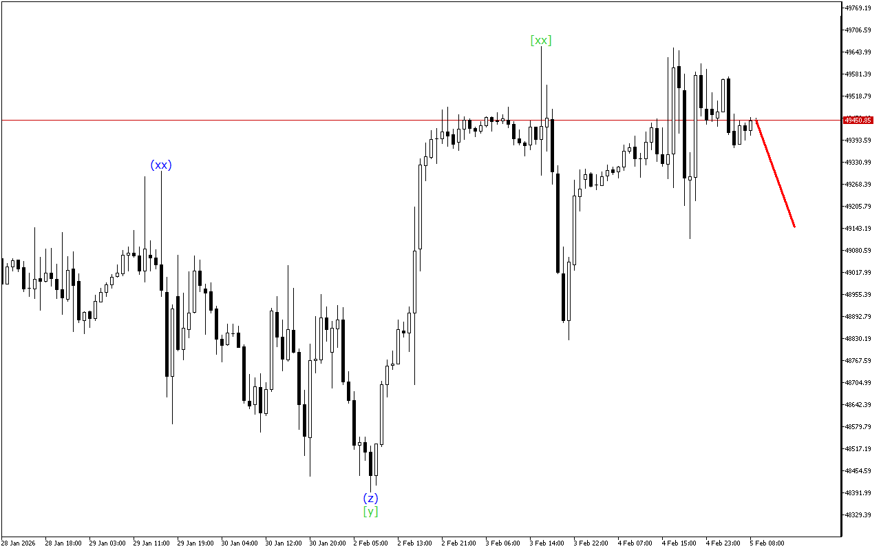 現在の動向は、トリプルスリーの形成を示しています。現時点では、波[xx]が形成されています。その形成後、下向きの波[z]の発展が予想されます。