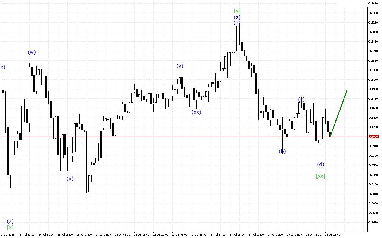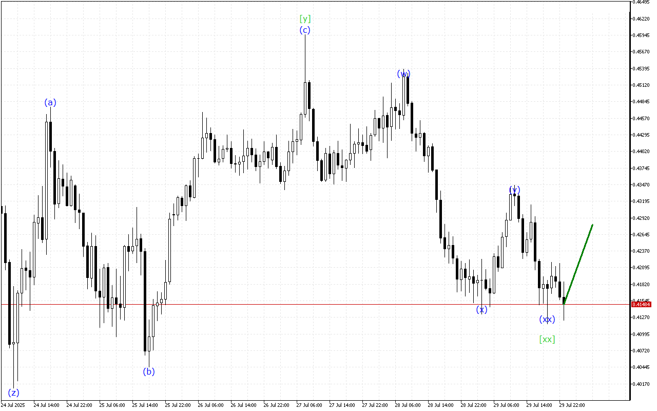 더 작은 시간 척도에 따르면, 시장은 ABC 지그재그 내에서 움직입니다. 현재 가격은 파동(c)의 형성을 완료하고 있으며 가격 움직임은 새로운 파동 형성으로 이동할 수 있습니다.