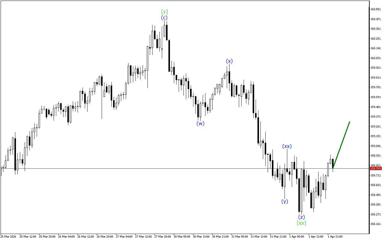 낮은 차수의 파동은 하향 ABC 지그재그의 형성을 나타냅니다. 파동 (c)는 이미 완료되었으므로 새로운 파동 구조의 형성을 예상할 수 있습니다.