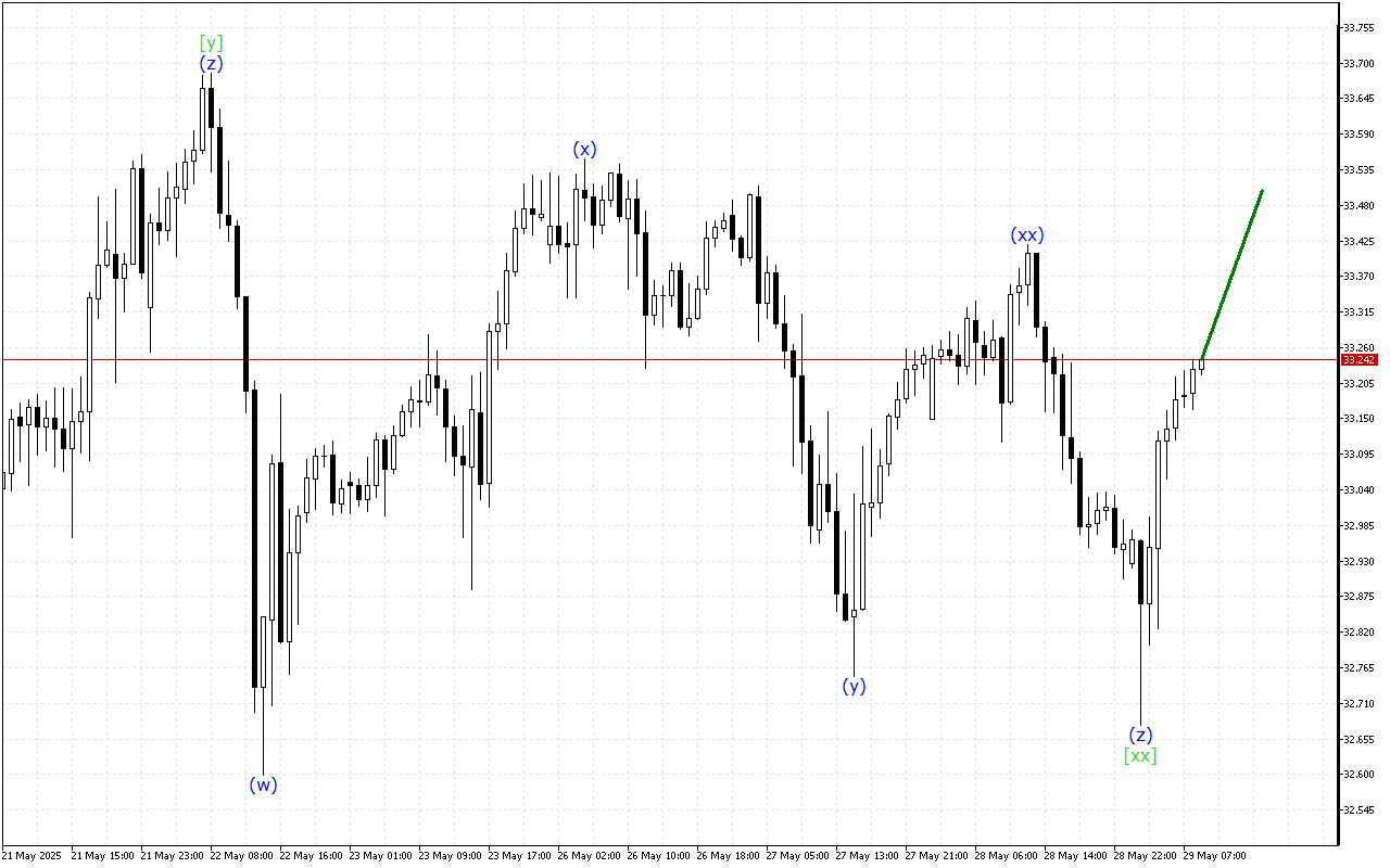 XAGUSD의 중기 이동 벡터는 Triple Three 파동 구조의 형성을 나타냅니다. 이제 파동 [xx]의 형성이 완료되었으며 파동 [z] 내에서 상향 이동의 시작이 예상됩니다.